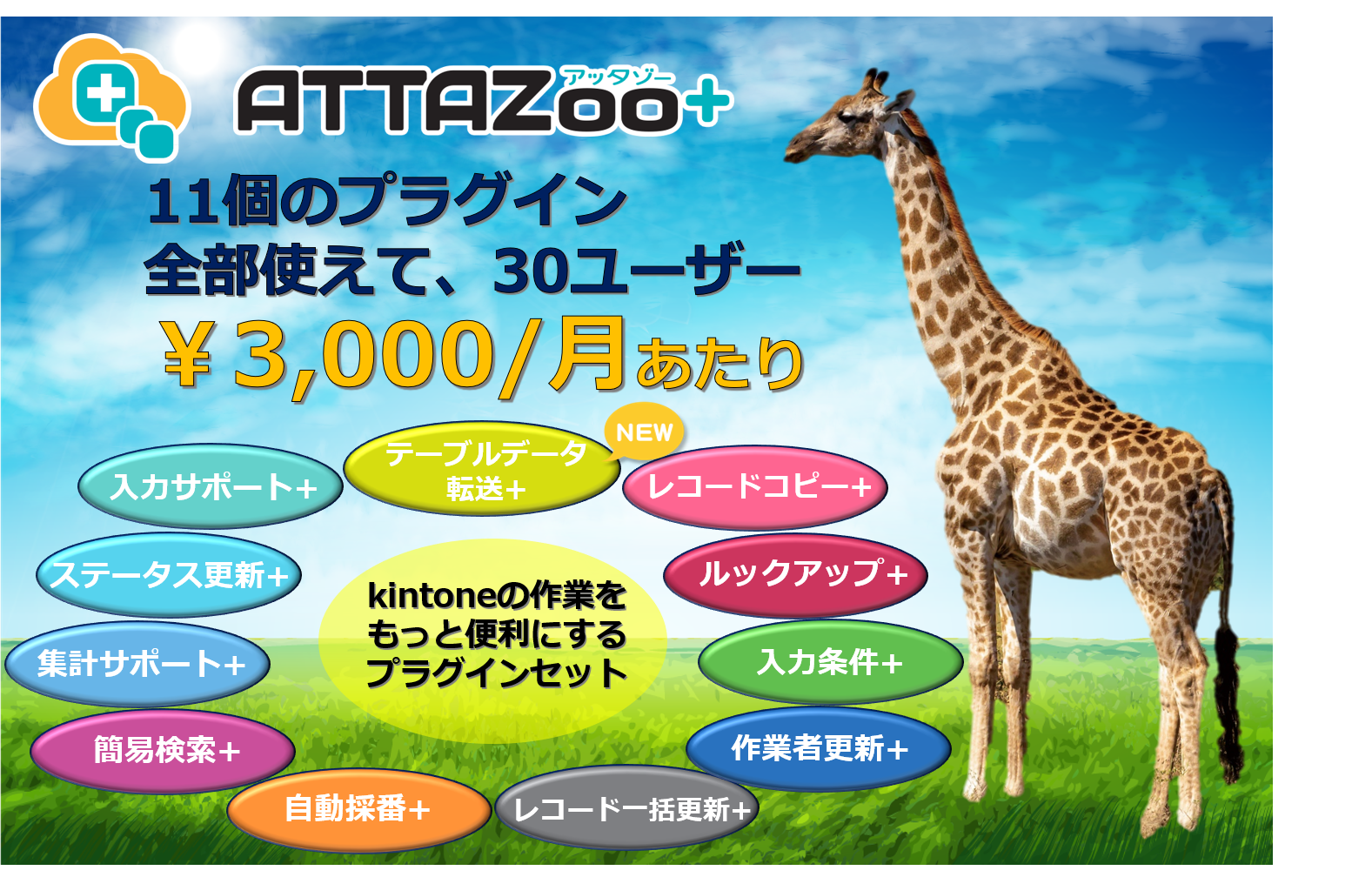 「ATTAZoo+(アッタゾー)」は、kintone アプリでよく使用する機能や、より便利に使うための機能を実装したプラグインをセットにした kintone プラグインです。
