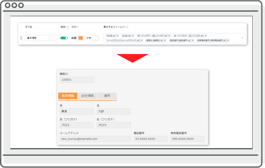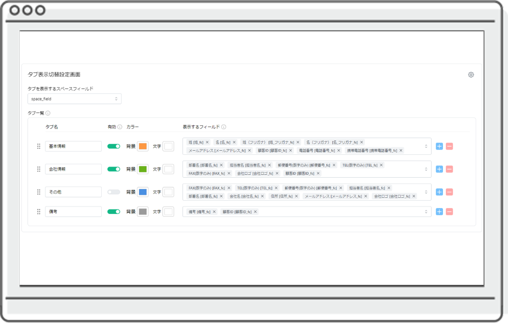 ・タブへ表示する文言やフィールド、表示色などを指定可能です。
